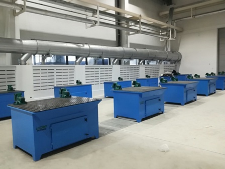 汉中陕飞铝合金打磨防爆除尘系统,通过打磨台下吸风与风墙侧吸风配合,有效的解决了打磨房内的工作环境,通过集中式防爆处理,解决了铝制打磨粉尘爆炸的隐患。